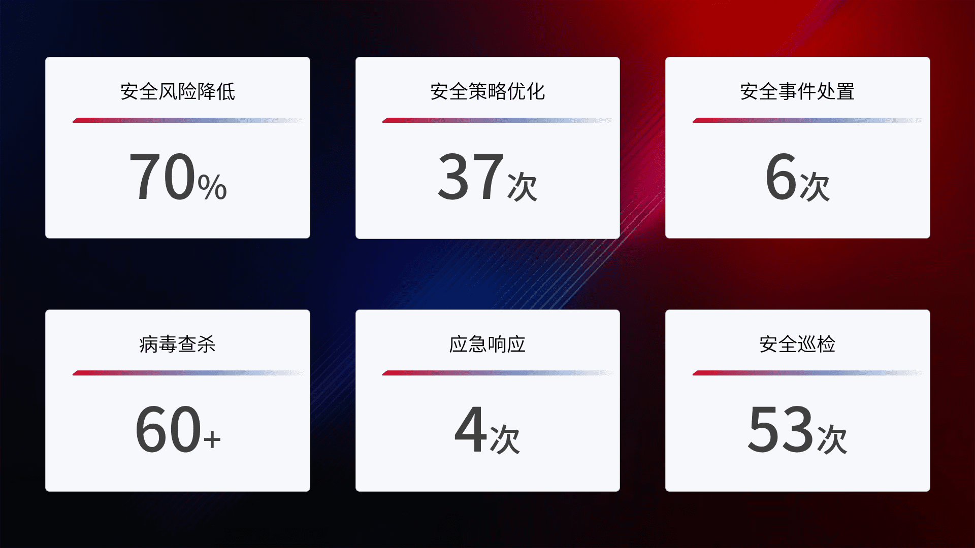 提供全面的安全事件报告体系,,,包括处置报告、、、周报、、、季度和年度总结,,,结合持续监控,,,,帮助客户深入了解网络安全状况。。
